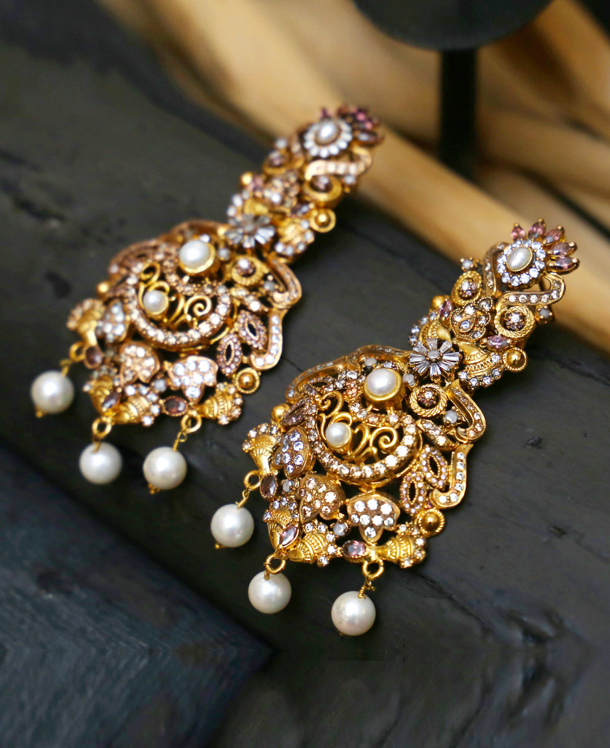 Stones: Champagne colored zircon polkies with clear and purple colored zircons and cultured pearls.
