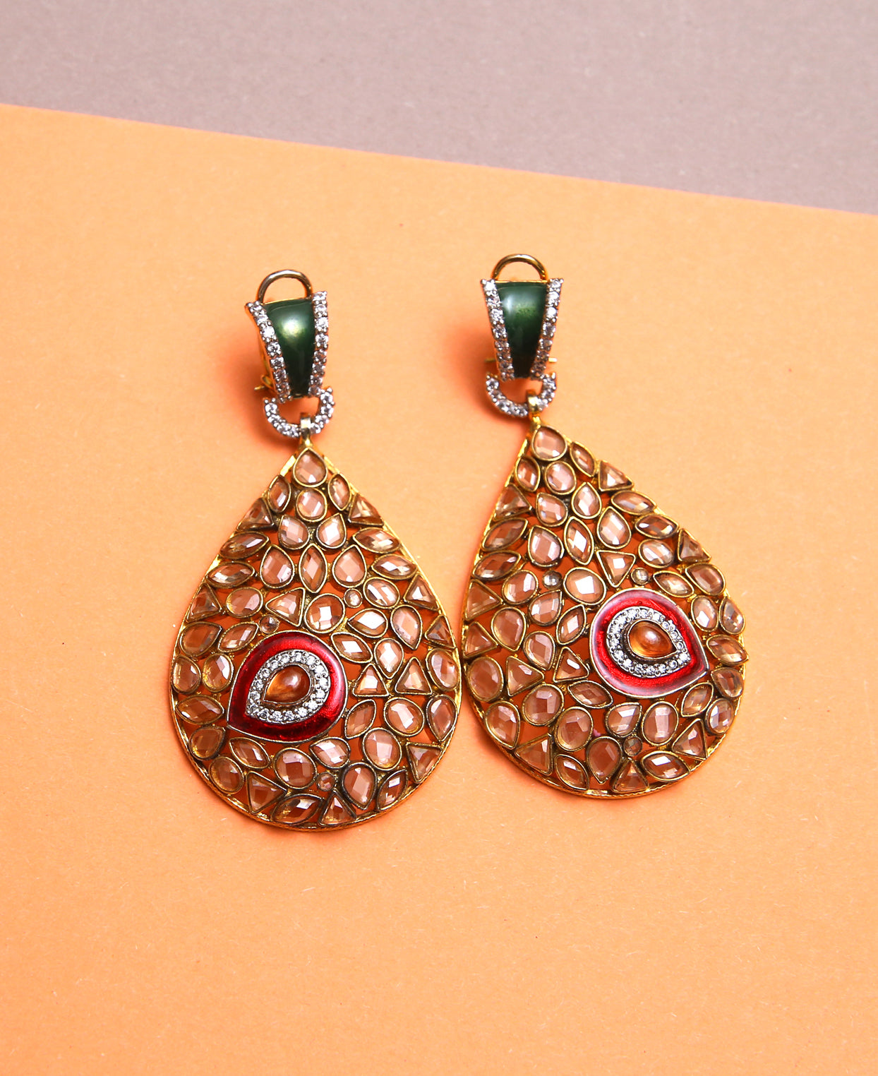 Stones: Champagne colored zircon polkies with clear zircons and red and green meenakari.