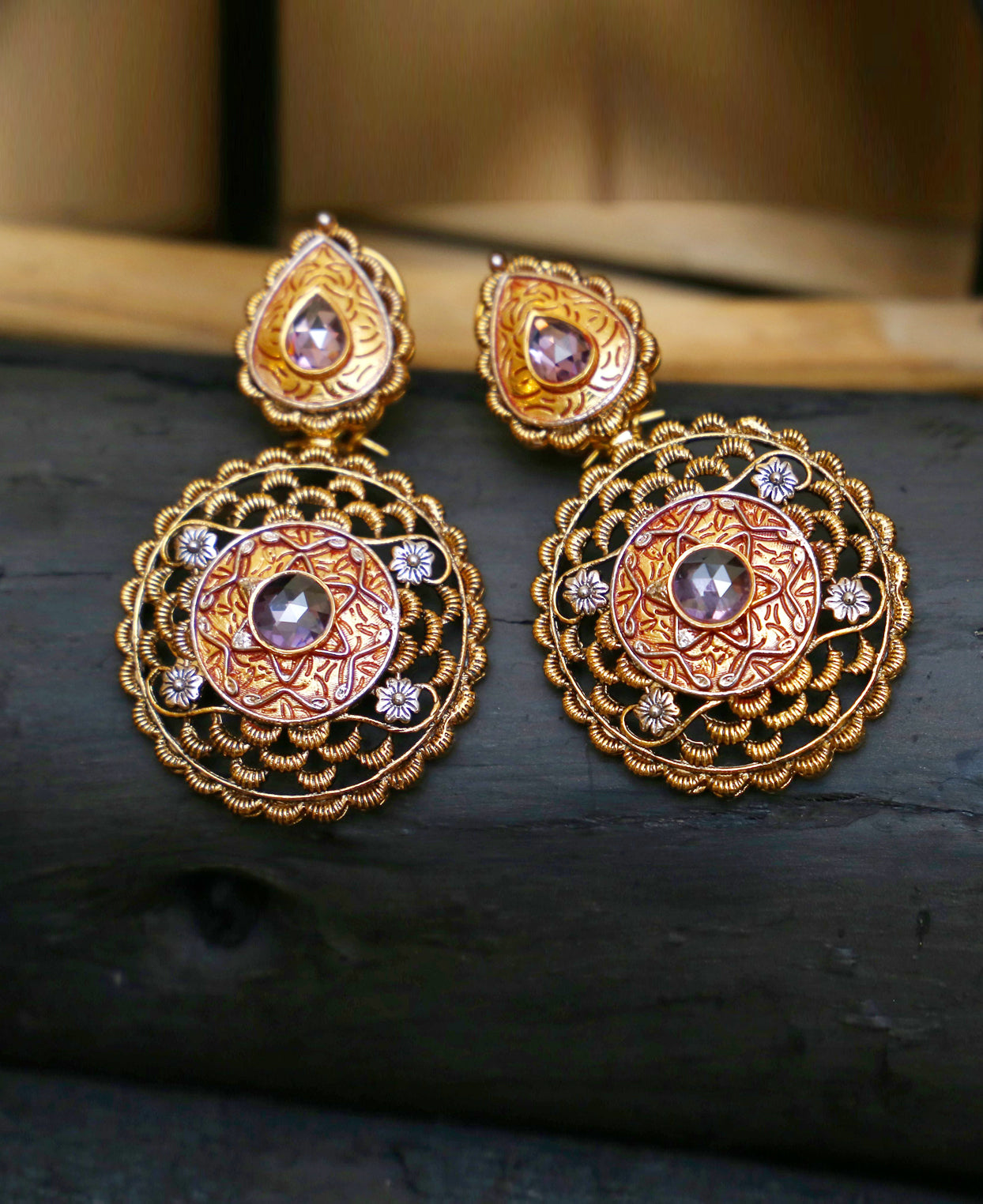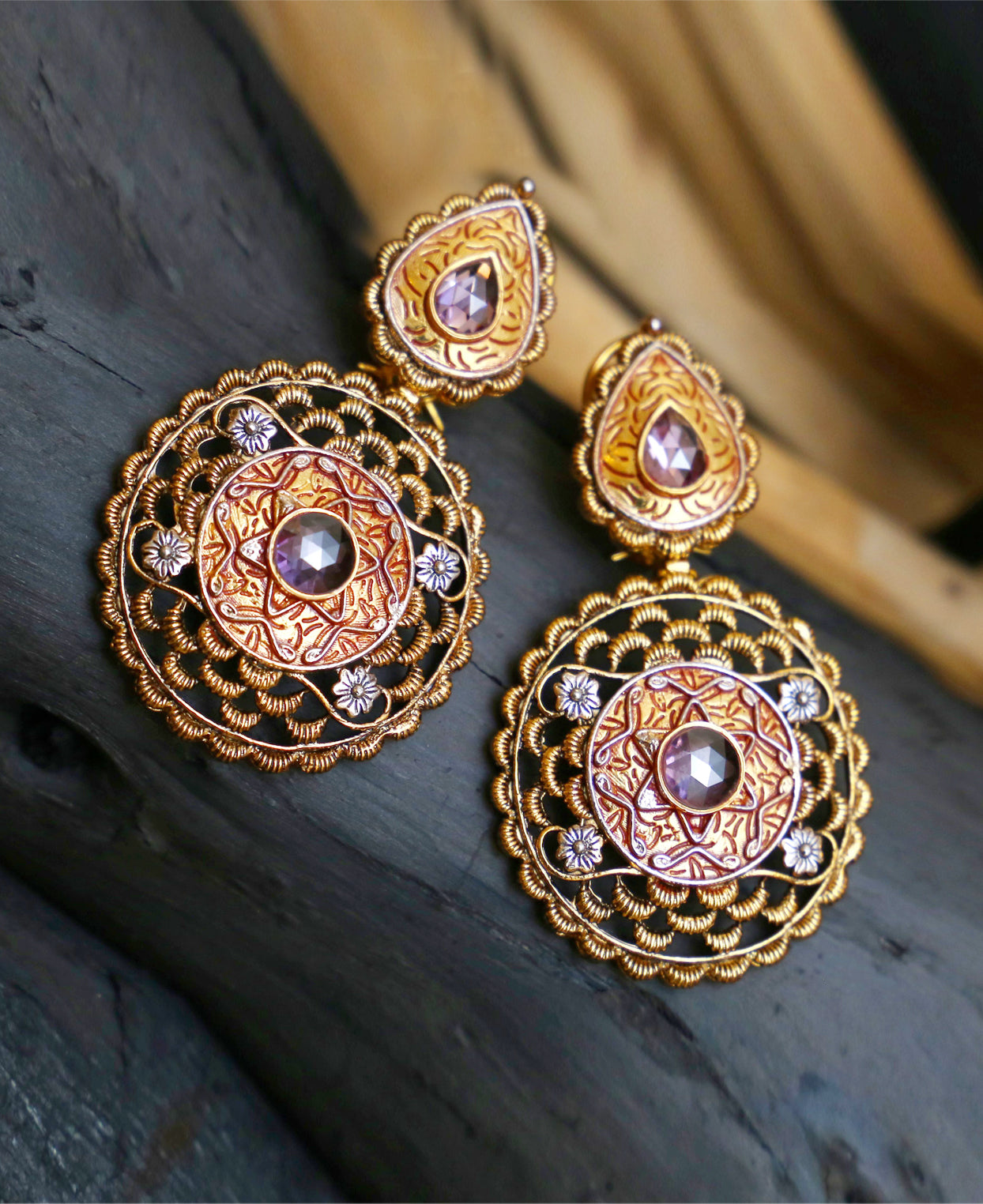 Plating: Gold Plated with rhodium finish on the texture lines. Champagne meenakari in on the texture part with some rhodium touching for a striking contrast look. Overall the earrings are antique finished.