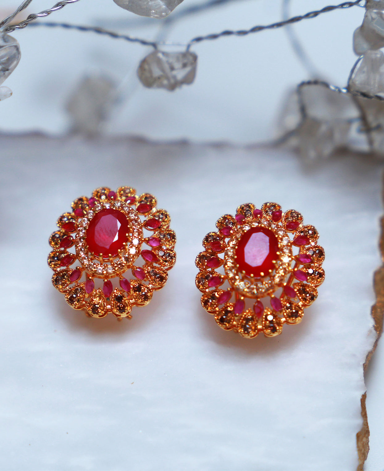 Stones: Treated rubies, clear and champagne colored zircons.